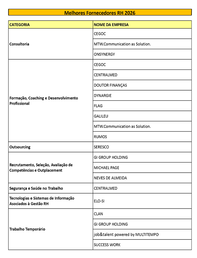A eleição das empresas distinguidas com o troféu “Melhores Fornecedores RH 2026” teve por base os resultados de um inquérito dirigido aos seus clientes, no qual os serviços que prestaram nos últimos 36 meses foram avaliados de modo anónimo e confidencial, no que respeita às seguintes dimensões: qualidade dos produtos e/ou serviços prestados, atendimento e profissionalismo dos colaboradores, relação qualidade/preço, satisfação global com o serviço, imagem do fornecedor e a lealdade ao fornecedor RH.